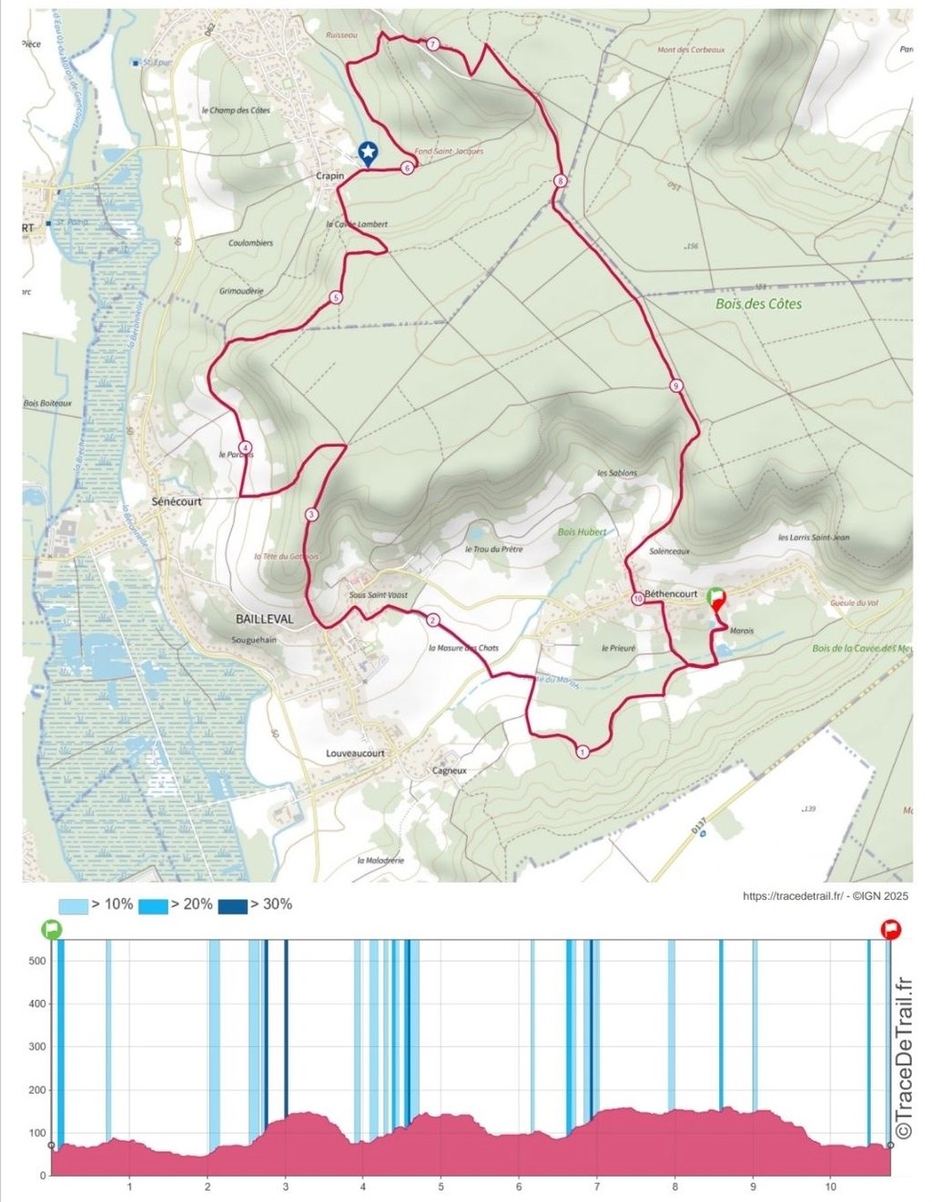 C'est le parcours le plus accessible, avec 300m de dénivelé sur une distance de 10,8km, qui vous permettra de découvrir le bois des côtes et la jolie commune de Bailleval.